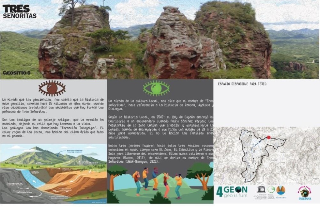 geobusRio Coco2025-06-30The new vision for the information panels in Rio Coco includes the principles of geoeducation, geoconservation, community involvement, indigenous knowledge and traditions and networking. One of the most significant geosites in the Rio Coco UGGp, is the “Tres Señoritas” geosite, located at the north in the Totogalpa municipality, where there are indigenous communities and a strong community involvement with the Geopark. The "Two-Eyed Seeing" (or Etuaptmumk in the Mi'kmaw language) concept is an Indigenous guiding principle that advocates for learning to see the world by drawing on the strengths of both Indigenous and Western knowledge systems. The core idea is to use these two perspectives together, for the benefit of all people and the world, without one dominating the other. After several exchanges between collaborators, local stakeholders and the contractor the new concept of the panel has been implemented.